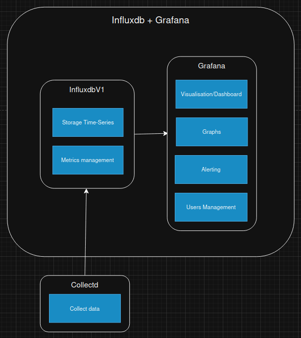 Il est compatible avec Collectd et Grafana. Il suffit alors de configurer les liens entre chacun des 3 composants. Cette fois-ci le schéma est clair : un composant fait la collecte des données sur chaque serveur, envoie les données sur le réseau, InfluxDB stocke et indexe ces données, puis Grafana requête cette base de données pour présenter les diagrammes.